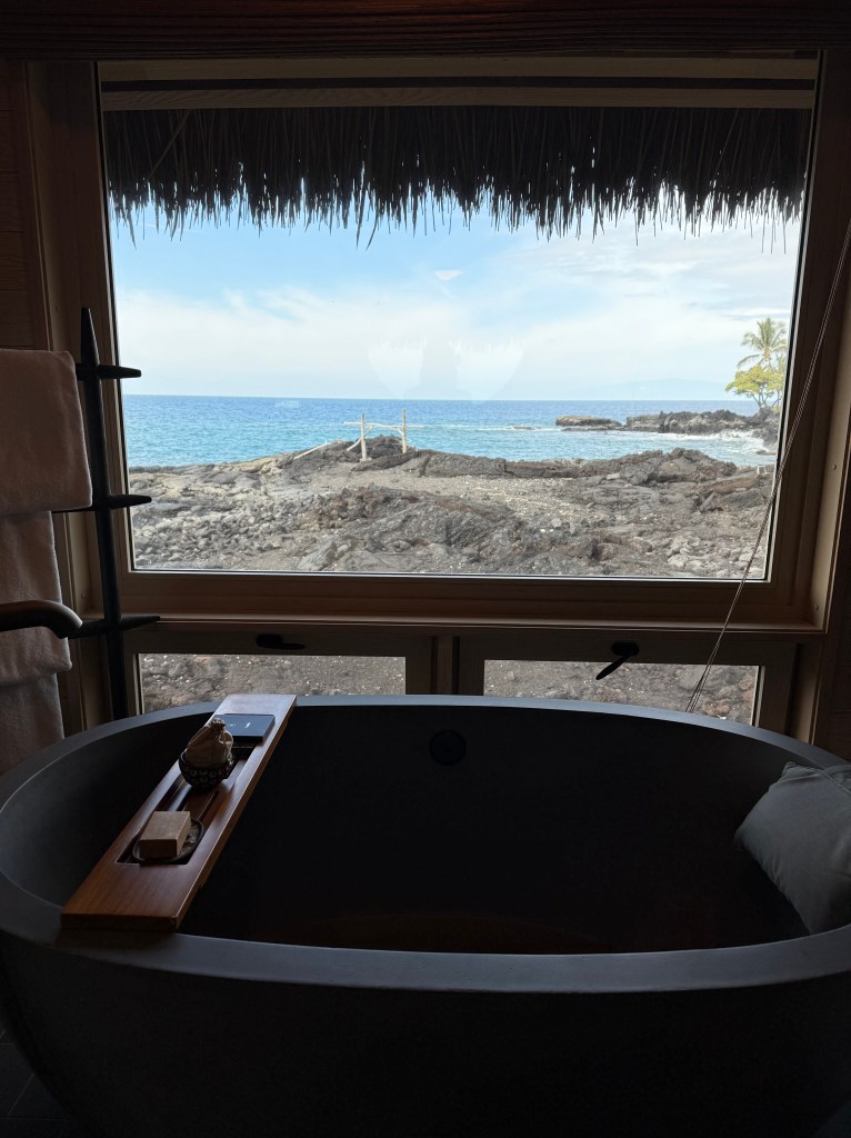 I think there is so much to love about this newly renovated Kona Village, and I think it shows by the locals coming for drinks/dinner, and guests who either wanted to go back to their old stomping ground or wanted to try what the hype was all about (like us!). The property was done very well – everything was thoughtfully put together, especially when they tried keeping a few legacy rooms from the original resort. But, being positioned to compete with the Four Seasons right next door, they’re just not there yet. We have only stayed at a few Rosewood hotels in Montecito, Vancouver (Canada), and Hotel Crillon in Paris, so I can’t quite tell where they would rank against the other famous luxury brands yet. Solely based on this experience, for the same amount of money (Four Seasons) or a bit more (Aman), the service level is significantly different.
