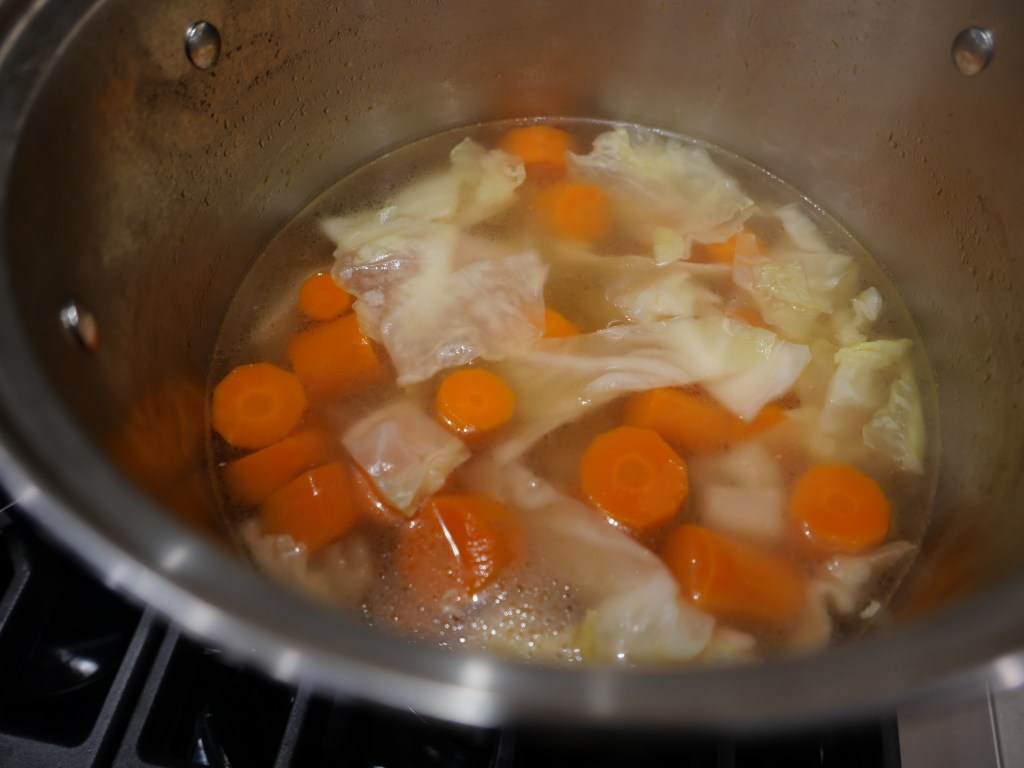 To start, fill a pot with water to cover the pork loin completely. Cook it until it is cooked (~135°F internally). Remove the pork and let it rest. In the same pot, add carrots, apple, and cabbage to the broth and cook until the veggies are soft and tender. Add more water to the pot as needed. At the same time, heat a pan with oil and cook the ground pork, adding salt and pepper to taste.