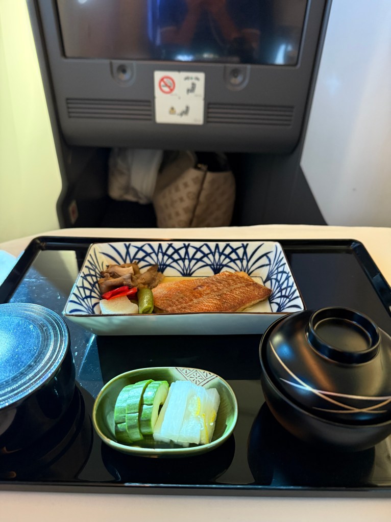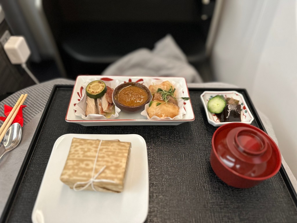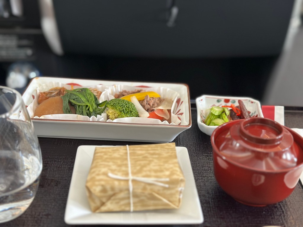 For context, I always opt for Japanese meals on any route I fly with either of them because why not? Similar to each other, the main meal consists of an amuse bouche, an appetizer, a main dish, and then dessert. Both of the meals are presented in smaller ceramic serving plates and bowls, which is definitely the warmest welcome (or goodbye) to Japan and truly makes the entire trip so much more exciting. THANK YOU, JAPANESE CARRIERS!