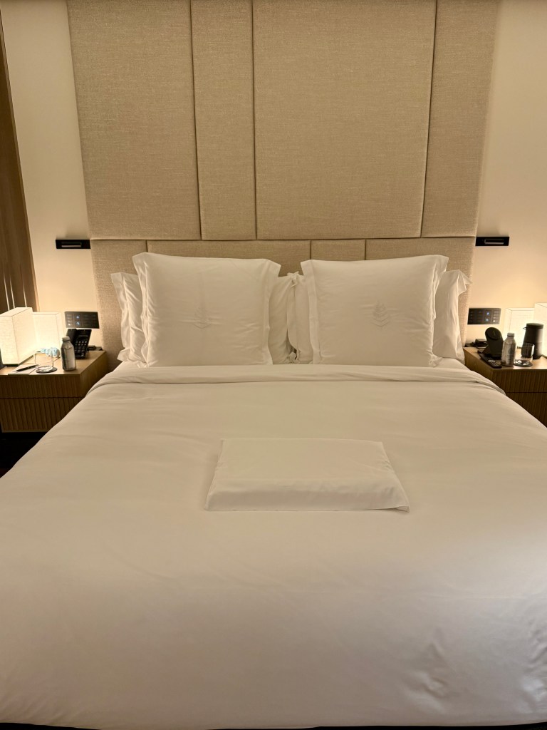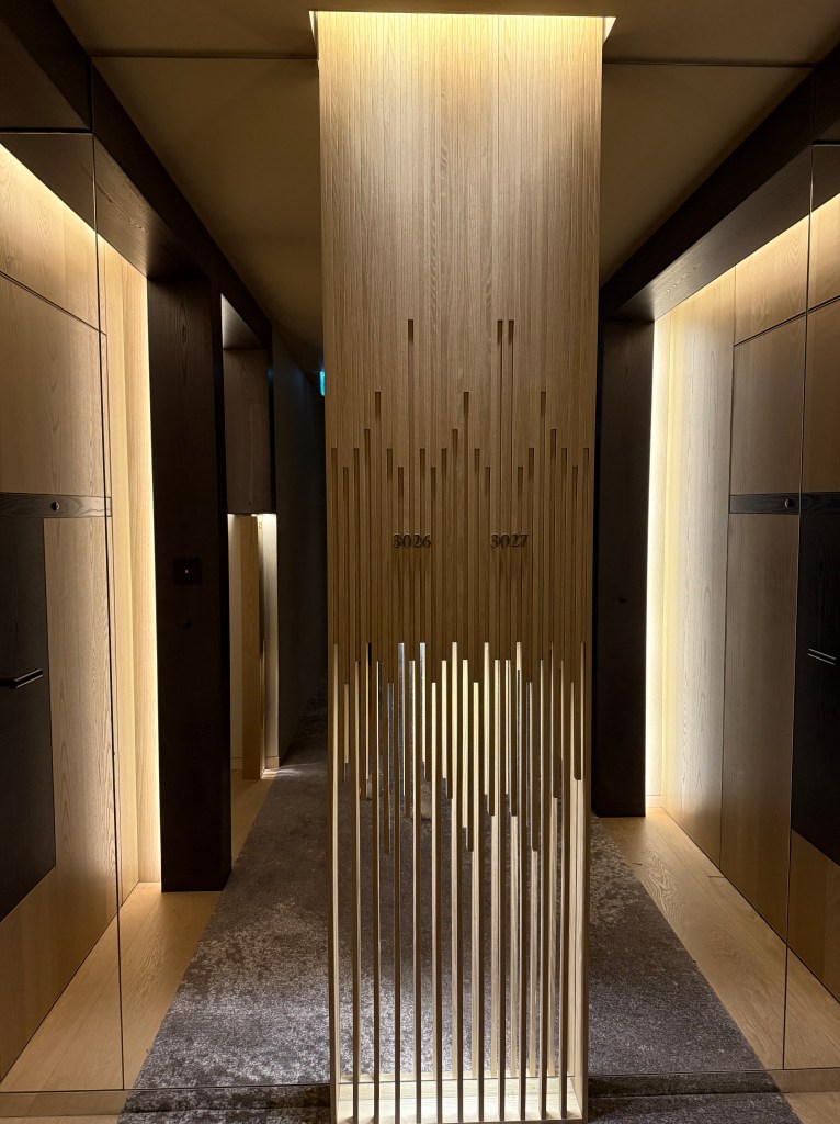 Coincidentally, the Four Seasons hotel had just recently opened in Osaka, which may be the reason my husband decided to accompany me. He went to Japan for the first time in 2022 in July, and the heat combined with an absolute tourist nightmare truly steered him away from the thought of coming back, unless it was family-related. Osaka used to have zero proper luxury accommodation, and I mean the real top-notch service with attention to detail and personal touches. Yes, there are the Ritz, or the St. Regis – and I apologize if those are someone’s favorites, but I really think this Four Seasons hotel Osaka has no competition in the city. Simple as that. Stunning property – the wood slats detail throughout the lobby and into the guest rooms, perfection. The earthy tone creates a very zen atmosphere despite being located in the middle of Umeda, where business buildings and luxury residences surround. Right through the entrance of the hotel, there is a water feature with a floating sculpture that immediately calms you down, and you will instantly feel at ease.
